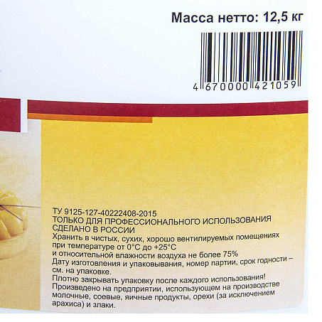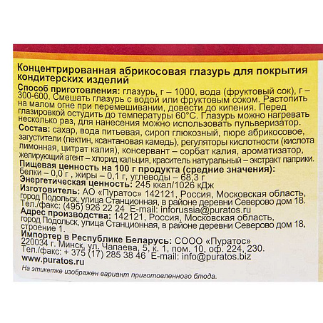 Концентрированная абрикосовая глазурь для покрытия кондитерских изделий. Только для профессионального использования. Плотно закрывать упаковку после каждого использования! Произведено на предприятии, использующем на производстве молочные, соевые, яичные продукты, орехи (за исключением арахиса) и злаки.