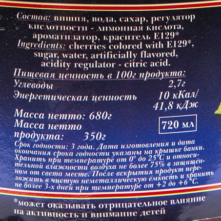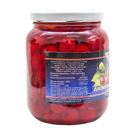 Коктейльная вишня с веточкой без косточки. Краситель в составе может оказывать отрицательное влияние на активность и внимание детей. После вскрытия продукт переложить в чистую неметаллическую емкость и хранить не более 3-х дней при температуре от +2 до +6°С.