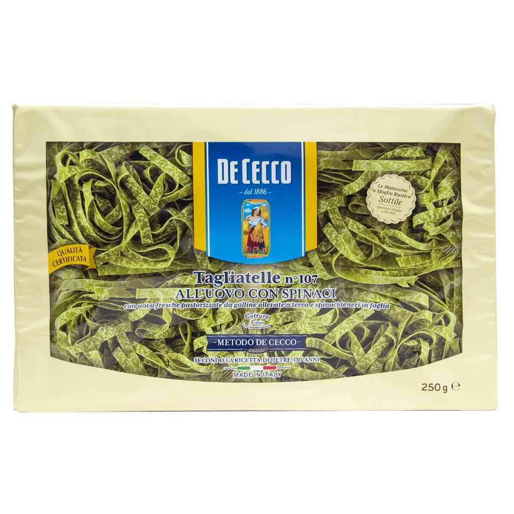 Для приготовления яичной пасты De Cecco используются исключительно натуральные свежие яйца (около 3-х дней после снесения), охлажденные до температуры 2-3 ° С. Шпинат, используемый в приготовлении теста, - из только что сорванных с грядки, бланшированных, а затем замороженных, нежных листьев шпината. Такие же что выбирают для домашнего приготовления опытные хозяйки. Феттучине относятся к семейству длинных макаронных изделий с плоским сечением, их толщина составляет 0,90 мм и ширина 7,10 мм. Сложно определить географическое происхождение этого формата, существующего и популярного во всей Италии. Феттучини, очень универсальны в приготовлении и подаются с различными соусами, особенно рекомендуются в рецептах с томатным соусом и рагу из мяса. А также прекрасно подходят для приготовления рецептов на основе морепродуктов, особенно с моллюсками.