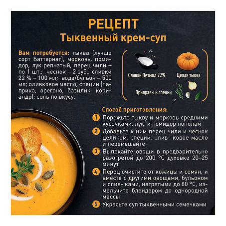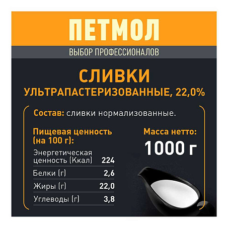Сливки 22% 1кг tetra-pak для супа и соуса Петмол™ ГОСТ БЗМЖ UHT Эйч энд Эн (198800) (КОД 49700) (0°С)