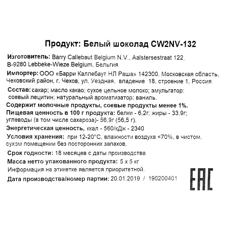 Шоколад белый 25,9% блок 5кг/пакет Callebaut Бельгия (CW2NV-132) (КОД 12299) (+18°С)
