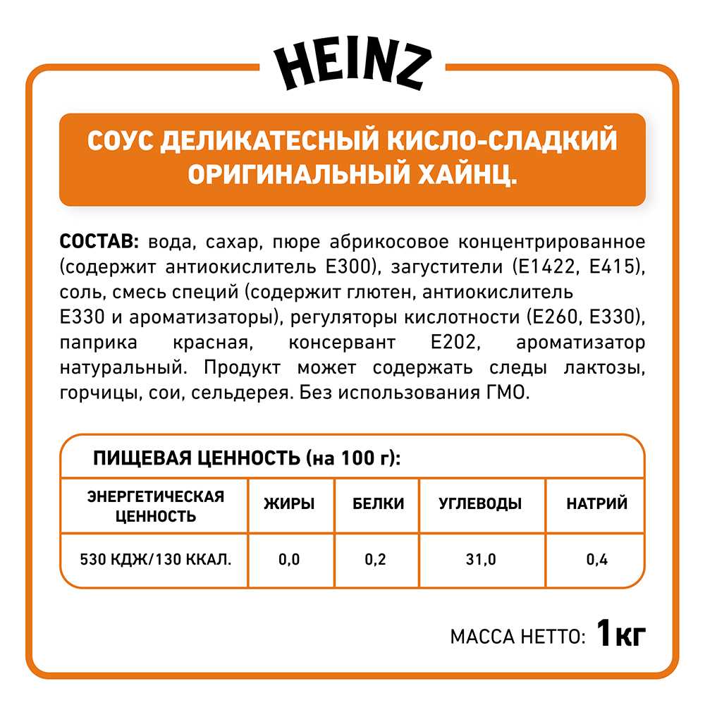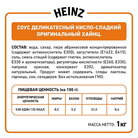 Готовый соус Кисло-сладкий Хайнц на основе абрикосового пюре и ананасового сока ценят за глянцевый абрикосовый колер и пряный фруктовый вкус. Профессиональный соус Кисло-сладкий Хайнц незаменим для заправки европейских и азиатских салатов, особенно плодоовощных. Им можно приправить горячую пиццу или использовать как основу. В меню ресторана готовый соус Кисло-сладкий Хайнц хорошо сочетается с беконом и курицей, поэтому идеален для хот-догов с ароматными жареными колбасками — куриной, свиной, бараньей или говяжьей. Его можно подавать как дип к различным закускам: картофелю по-деревенски или фри, наггетсам, куриным крыльям или ножкам, сырным палочкам или луковым кольцам во фритюре, его вкусно есть с корочками пиццы. Кроме того, готовый соус Кисло-сладкий Хайнц подходит для запекания рыбы, курицы, баранины, дичи и овощей — как в качестве маринада, так и для глазирования.