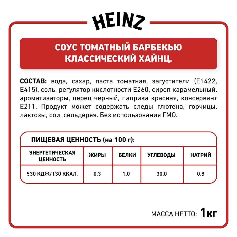 Готовый соус Барбекью Хайнц ценят за сбалансированность дымного вкуса и универсальность — он органично комбинируется со сладким, солёным, кислым, горьким и острым. Профессиональный соус Барбекью Хайнц сочетается с бургерами, пиццей, хот-догами, сэндвичами и тапас, используется для маринования говяжьих и свиных рёбер, птицы и морепродуктов. В меню ресторана готовый соус Барбекью Хайнц можно подавать как дип к различным закускам: картофелю по-деревенски или фри, наггетсам или куриным крыльям. В меру острый, томатный соус Барбекью Хайнц раскрывает и освежает вкус блюд из мяса, рыбы, птицы и овощей, особенно жареных и приготовленных на гриле.
