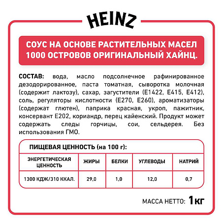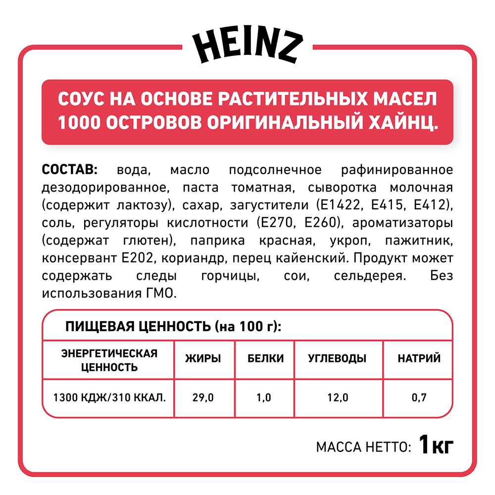 Готовый соус 1000 островов Хайнц — классический соус средиземноморской и американской кухни с нежным сливочно-томатным вкусом и пряным ароматом. В его составе горчица, майонез, соус Уорчестер, томаты, травы и специи. Профессиональный соус 1000 островов Хайнц идеален для морских коктейлей, блюд из креветок и рыбы, сочетается с курицей и говядиной. В меню ресторана готовый соус 1000 островов Хайнц подойдёт для бургеров, пиццы, хот-догов и шаурмы. Его также можно подавать в качестве дипа к горячим и холодным закускам: картофелю по-деревенски или фри, наггетсам, куриным крыльям или ножкам, рыбным палочкам, домашним чипсам или кольцам кальмара во фритюре.