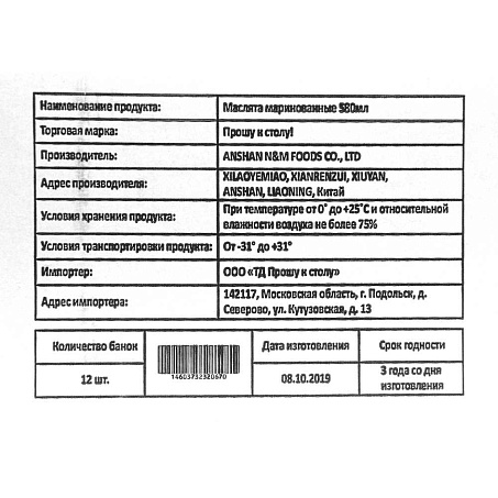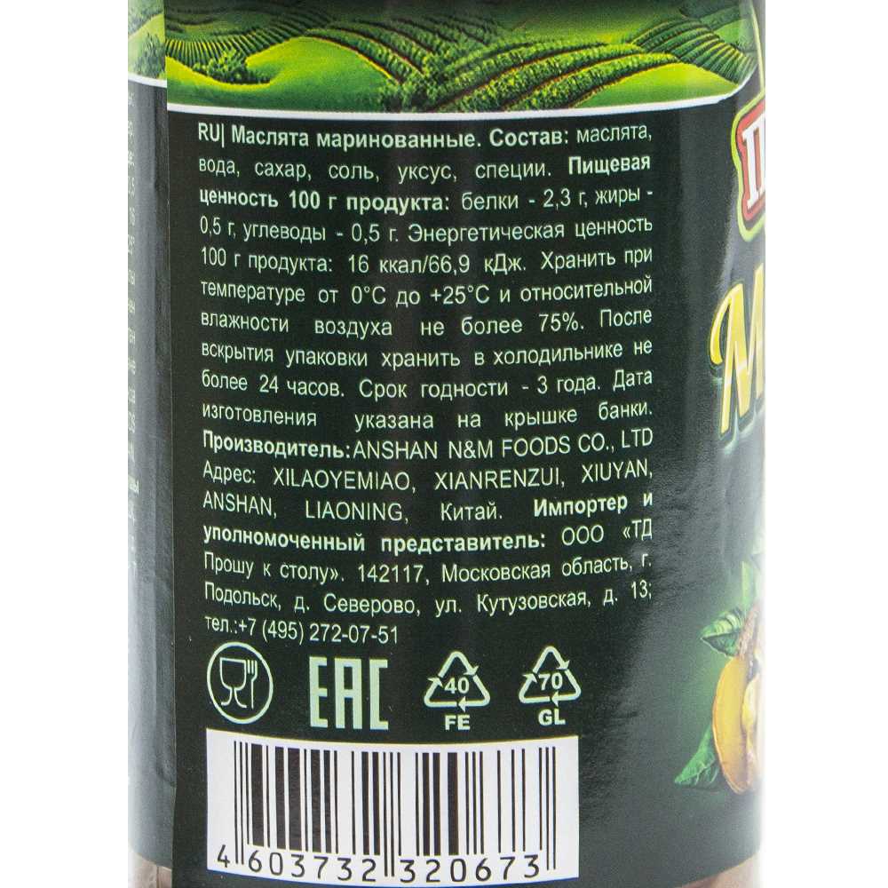 Детальное описание: Маслята маринованные. После вскрытия упаковки хранить в холодильнике не более 24 часов.