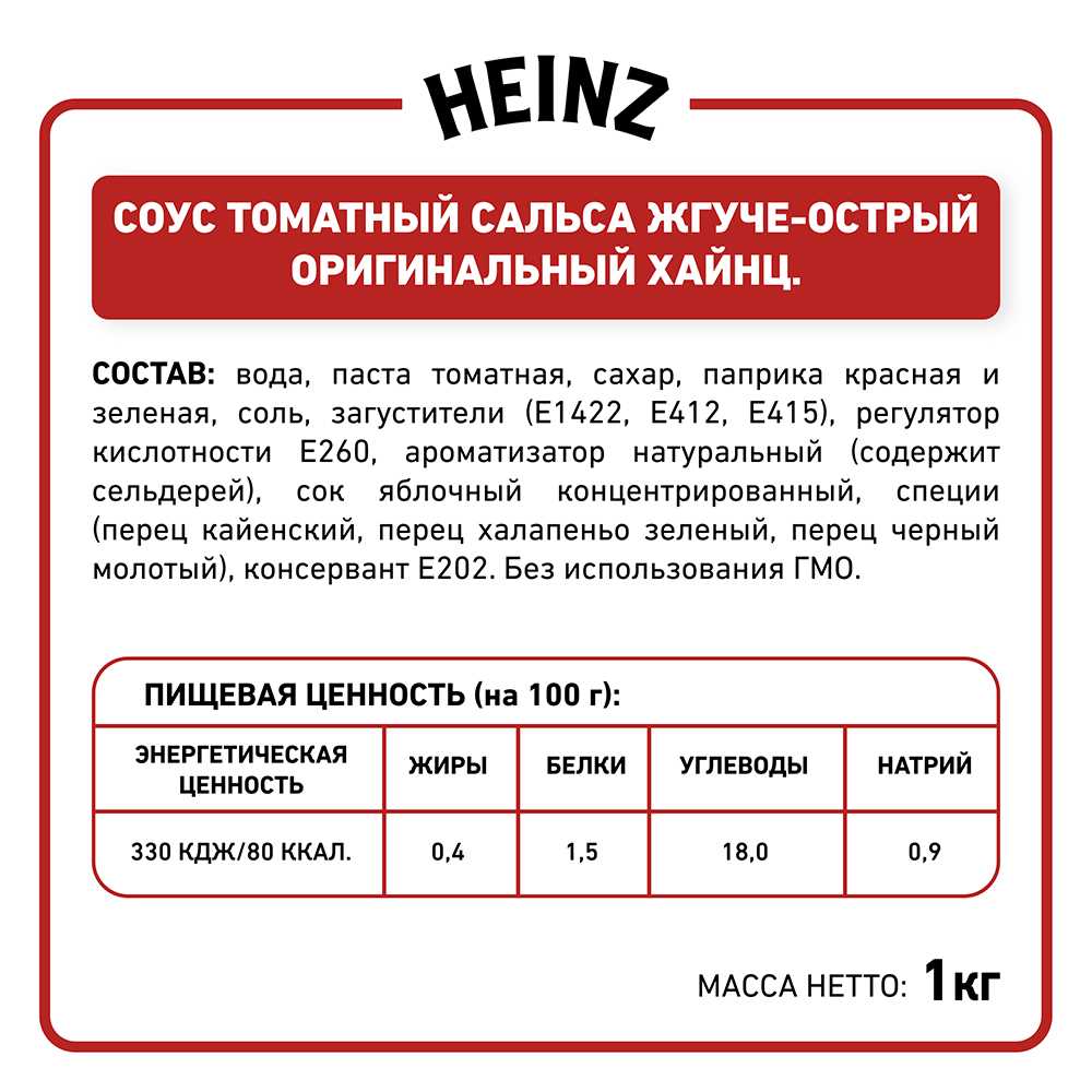 Готовый соус Сальса Хайнц ценят за острый вкус, лёгкую однородную текстуру с вкраплениями кусочков красной паприки и универсальность — он сочетается с пастой и фасолью, курицей и дичью, мясными и рыбными блюдами, особенно жареными и приготовленными на гриле. Профессиональный соус Сальса Хайнц подходит для бургеров, пиццы, хот-догов, сэндвичей и тапас, используется для маринования говяжьих и свиных рёбер, птицы и морепродуктов. В меню ресторана готовый соус Сальса Хайнц можно подавать как дип к закускам и апетайзерам: картофелю по-деревенски или фри, наггетсам или куриным крыльям, тако, кесадилье и начос.