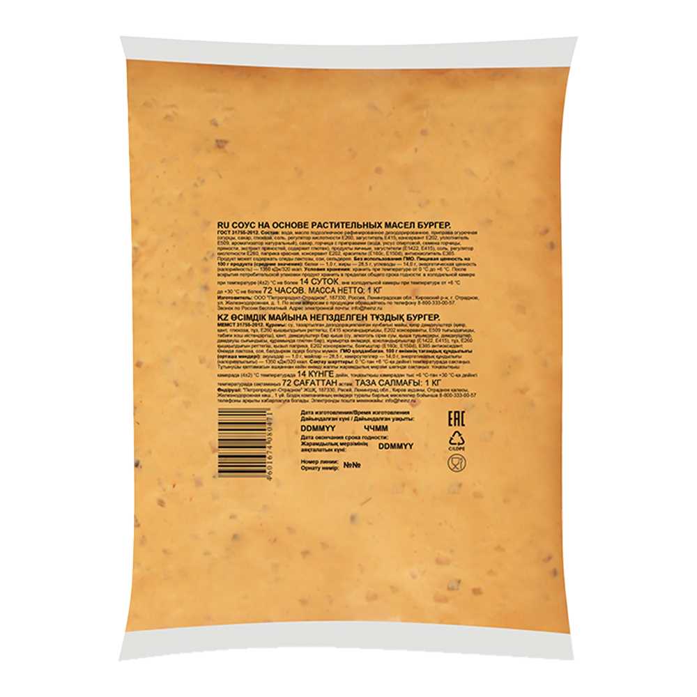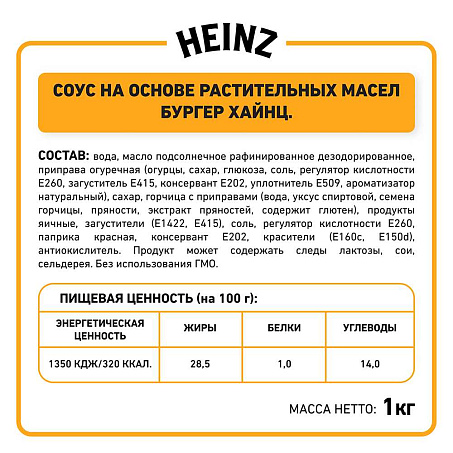 вода, масло растительное, приправа огуречная (огурцы, сахар, глюкоза, соль, регулятор кислотности кислота уксусная, ароматизатор, уплотнитель Е509, загуститель E415, консерванты: Е202, E211), сахар, горчица (вода, уксус спиртовой, семена горчицы, специи, экстракт специй), продукты яичные, загустители (Е1422, Е415), соль, регулятор кислотности кислота уксусная, паприка молотая, красители (Е160с, Е150d), консервант Е202, антиокислитель Е385. Без использования ГМО.