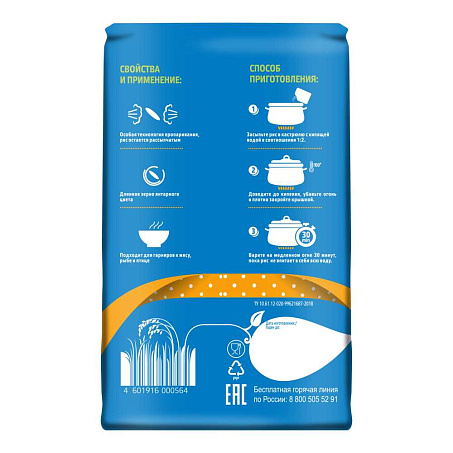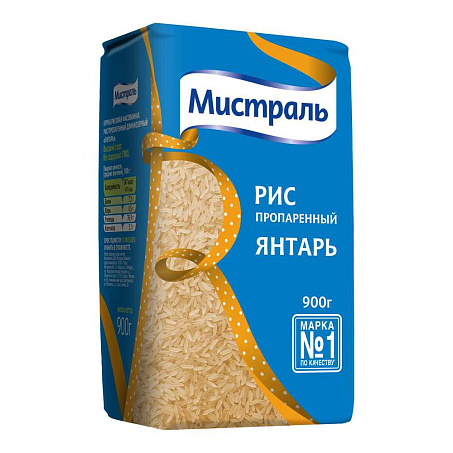 Рис Янтарь пропаренный длиннозерный 900гр х 12шт пакет Мистраль Россия (КОД 23067) (+18°С)