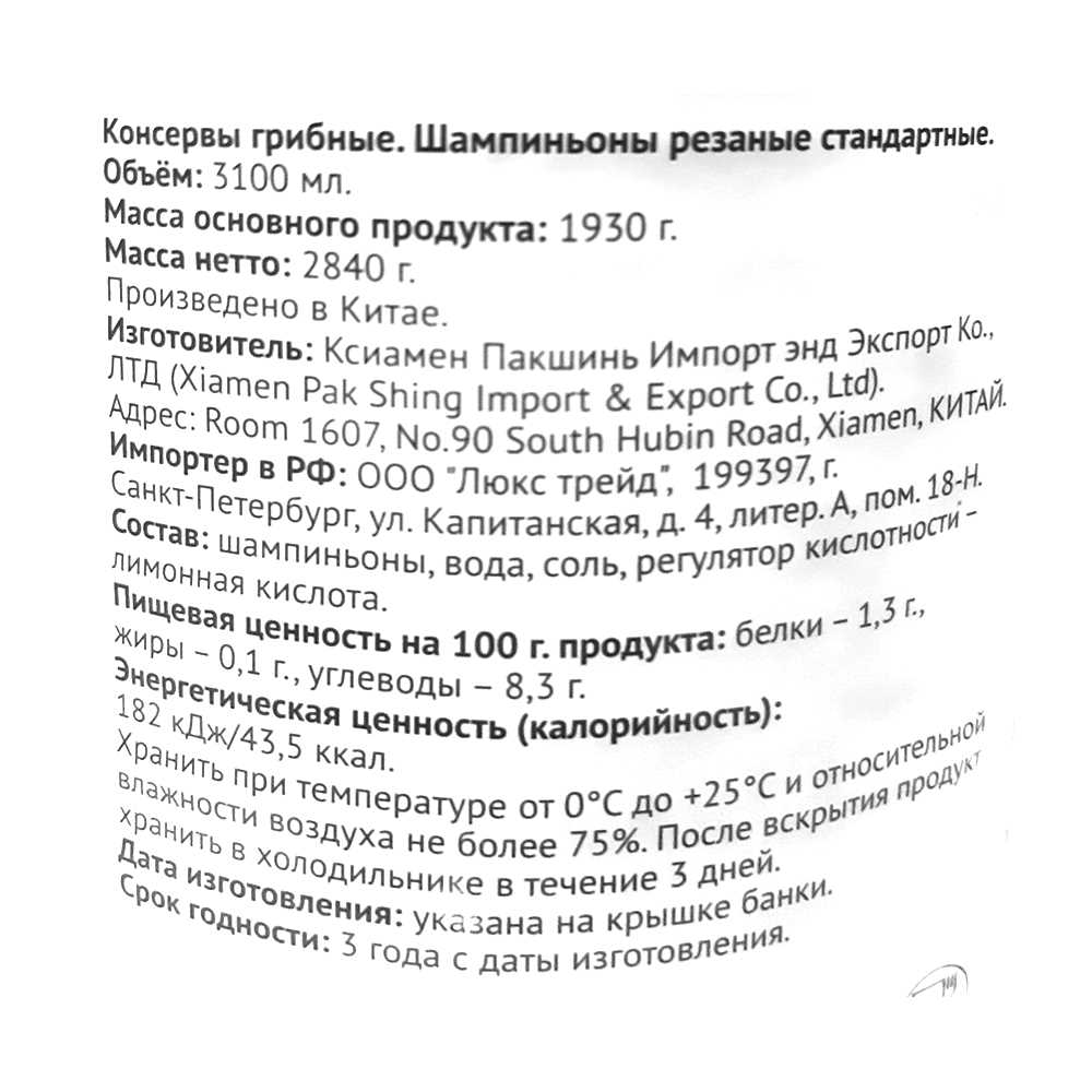 Детальное описание: Консервы грибные. Шампиньоны резаные стандартные. После вскрытия продукт хранить в холодильнике в течение 3 дней.