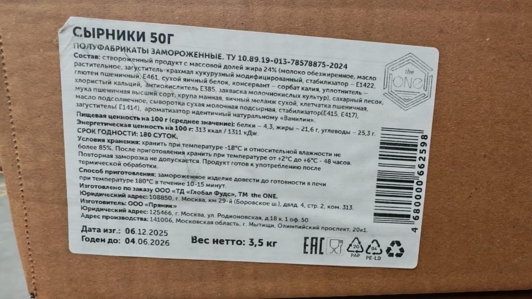 Сырники из створоженного прод. 50гр х70шт/кор The one™ Россия (ПУ) (КОР) (КОД 98754) (-18°С)