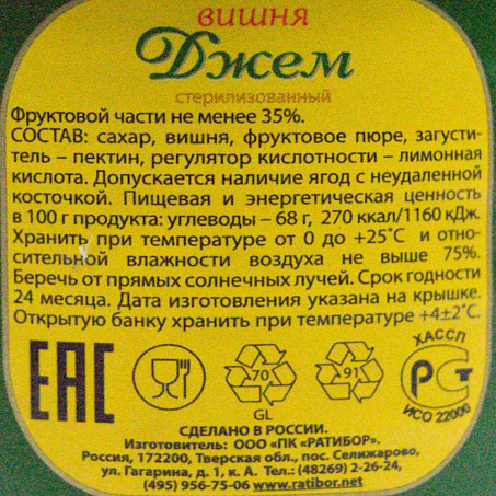 Джем вишня 360гр ст/б Ратибор Россия (КОД 71807) (+18°С)