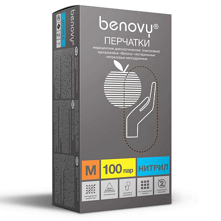Перчатки нитриловые смотровые, размер M, 200шт/уп (голубые) Benovy® Малайзия (КОД 99654) (+18°С)