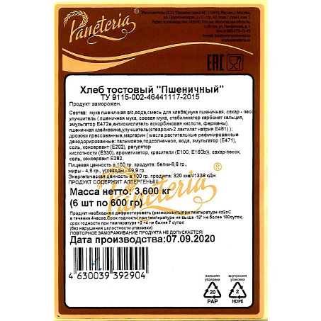 Хлеб тостовый пшеничный 11х11см 19ломт 600гр х6упак/кор Paneteria Промпоставка-М (КОР) (КОД 36093) (-18°С)