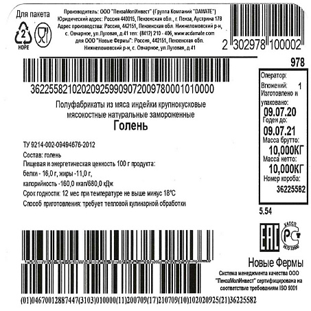 Индейка голень н/к с кожей самка ~9-11кг/кор Новые Фермы® ПензаМолИнвест (978) (КОР) (КОД 40864) (-18°С)