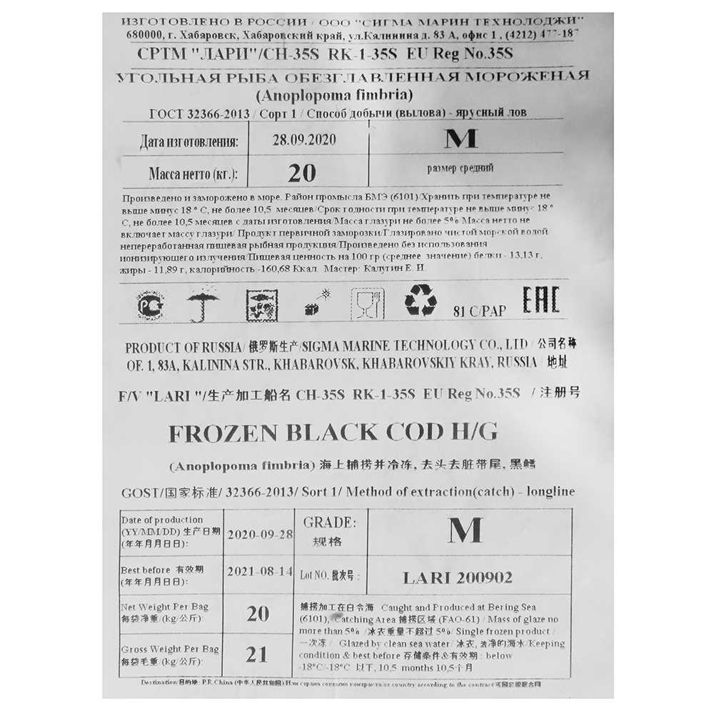 Угольная рыба пбг Anoplopoma fimbria (М) 20кг/блок 5%гл 1сорт Сигма Марин (ПУ) (КОР) (КОД 45597) (-18°С)