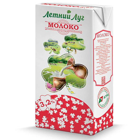 Молоко 3,2% 1л tetra brik Летний Луг™ ГОСТ БЗМЖ UHT Оренбургский МК Россия (КОД 46528) (0°С)