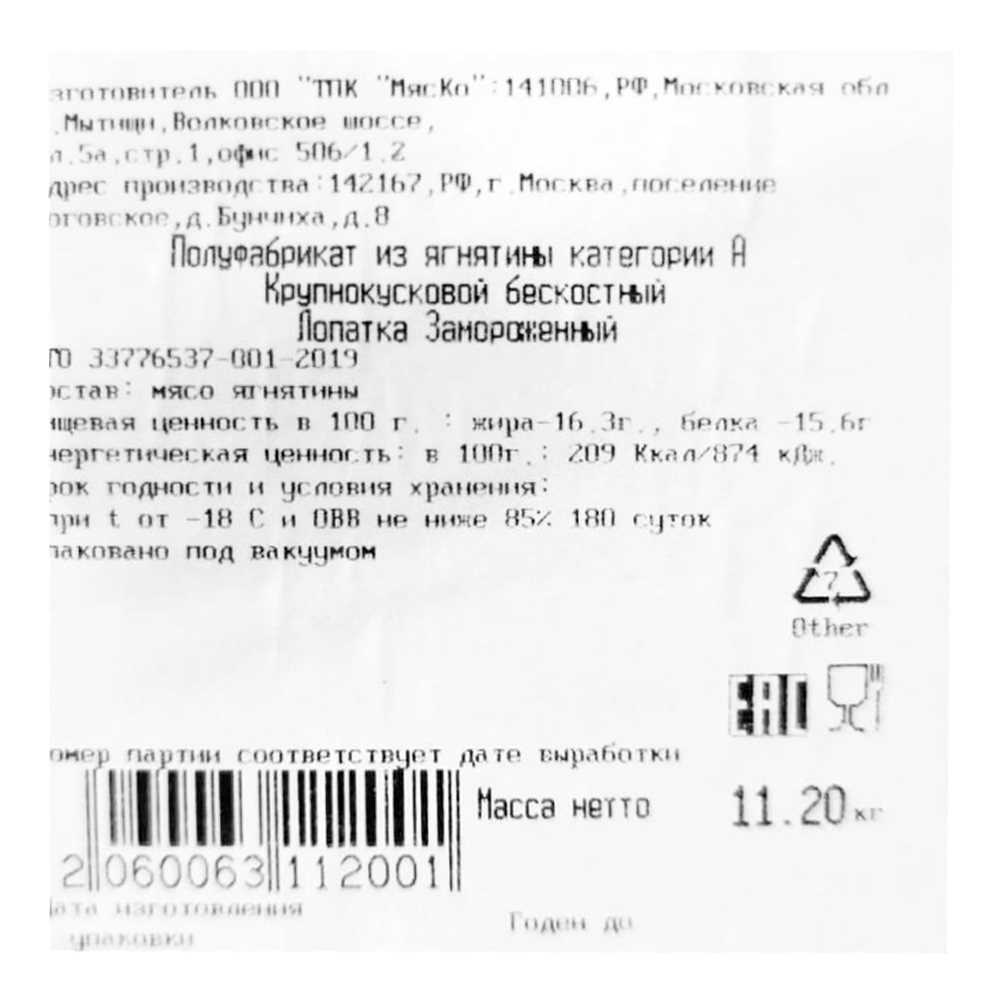 Ягнятина Лопатка б/к ~2кг пакет с/м СТО кат.А МясКо Россия (КОД 46935) (-18°С)