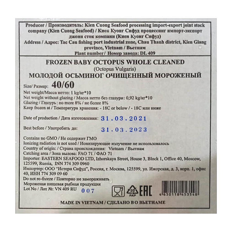Осьминоги 40/60 целые зачищ с/м 1кг пакет 8%гл IQF Oct.Vulgaris Вьетнам (ПУ) (КОД 47654) (-18°С)
