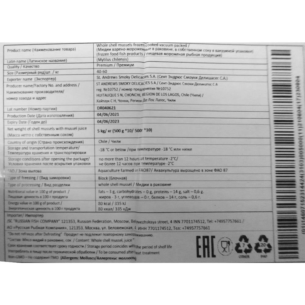 Мидии голубые в раковинах в/м 40/60шт 500гр/уп в/у в собств соку Чили (ПУ) (КОД 49056) (-18°С)