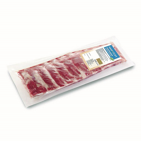 Одна мясокостная реберная пластинка с корейки (с прирезью мяса карбонада и шпика) с ребрами и межреберным мясом с естественным соотношением тканей в вакуумной упаковке.