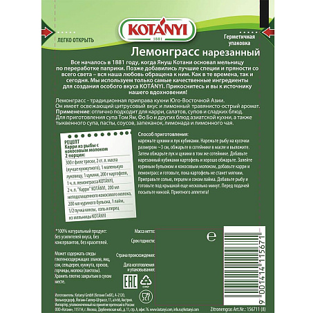 Лемонграсс нарезанный сушеный 15гр/пакет Kotanyi™ Австрия (КОД 50119) (+18°С)
