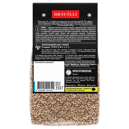 Рекомендации по приготовлению: в кипящую подсоленную воду засыпать полбу (из расчета на 100 г полбы 250 мл воды). Варить на медленном огне под крышкой 35-40 минут, периодически помешивая.