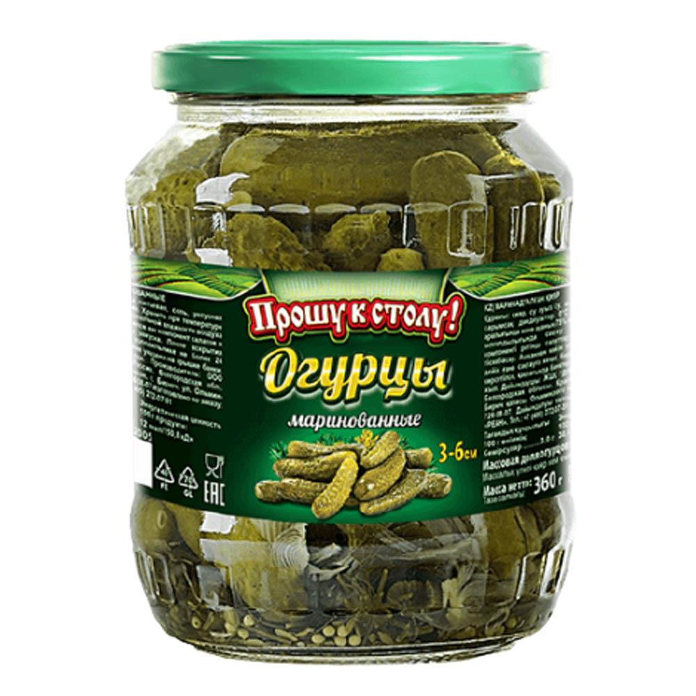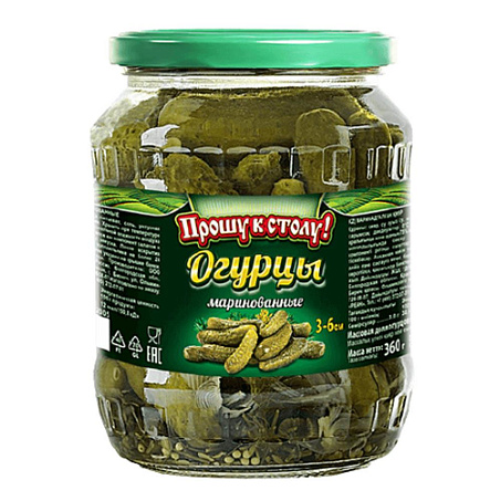 Внешний вид: Свойственные данному виду продукции, консистенция плотная. Вкус и запах: Свойственные маринованным огурцам, ярко-зеленый, без посторонних привкуса и запаха, с ароматом пряностей и уксуса