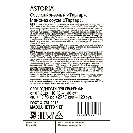Вода, масло подсолнечное, наполнитель (огурец, вода, сахар, загустители: Е1442, ксантановая камедь, глюкозно -фруктозный сироп, спиртовой уксус, соль, укроп, ароматизаторы, перец, регулятор кислотности - лимонная кислота), сахар, загустители (Е1442, ксантановая камедь), уксус, яичный желток, соль, ароматизаторы, петрушка, лук, чеснок, регулятор кислотности - лимонная кислота, консерванты (сорбиновая кислота, Е385). Продукт содержит лактозу и горчицу, может содержать следы орехов; сои; сельдерея