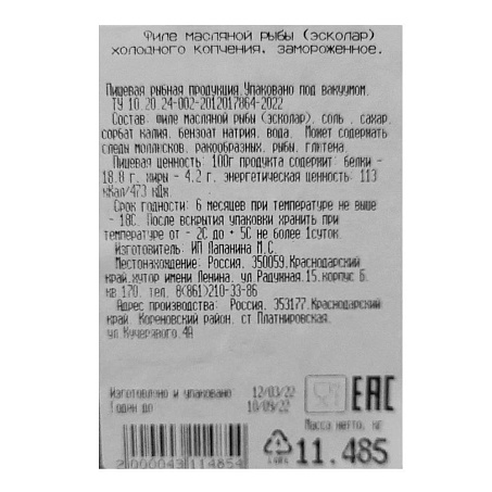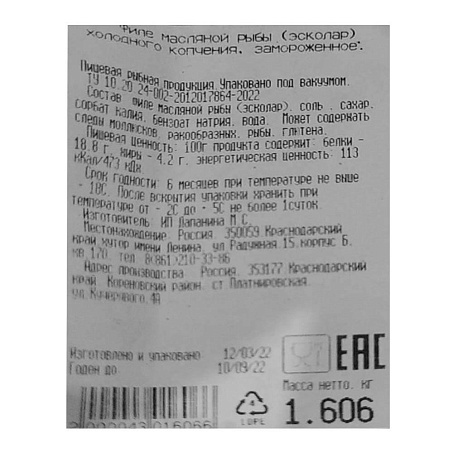 филе масляной рыбы (эсколар), соль, сахар, сорбат калия, бензоат натрия, вода.