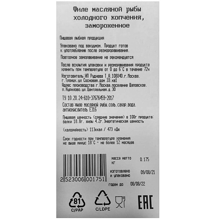 Филе масляной рыбы, соль, сахар, вода, антиокислитель Е316