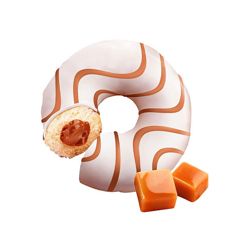 мука пшеничная хлебопек в/с, глазурь жировая, крем пастеризованный для пищевых продуктов со вкусом карамели, вода питьевая,жир специального назначения кондитерский, сироп глюкозно-фруктозный, смесь сухая для дрожжевых пончиков, сахар, глазурь жировая со вкусом карамели, дрожжи хлебопекарные прессовынные сухие, соль.