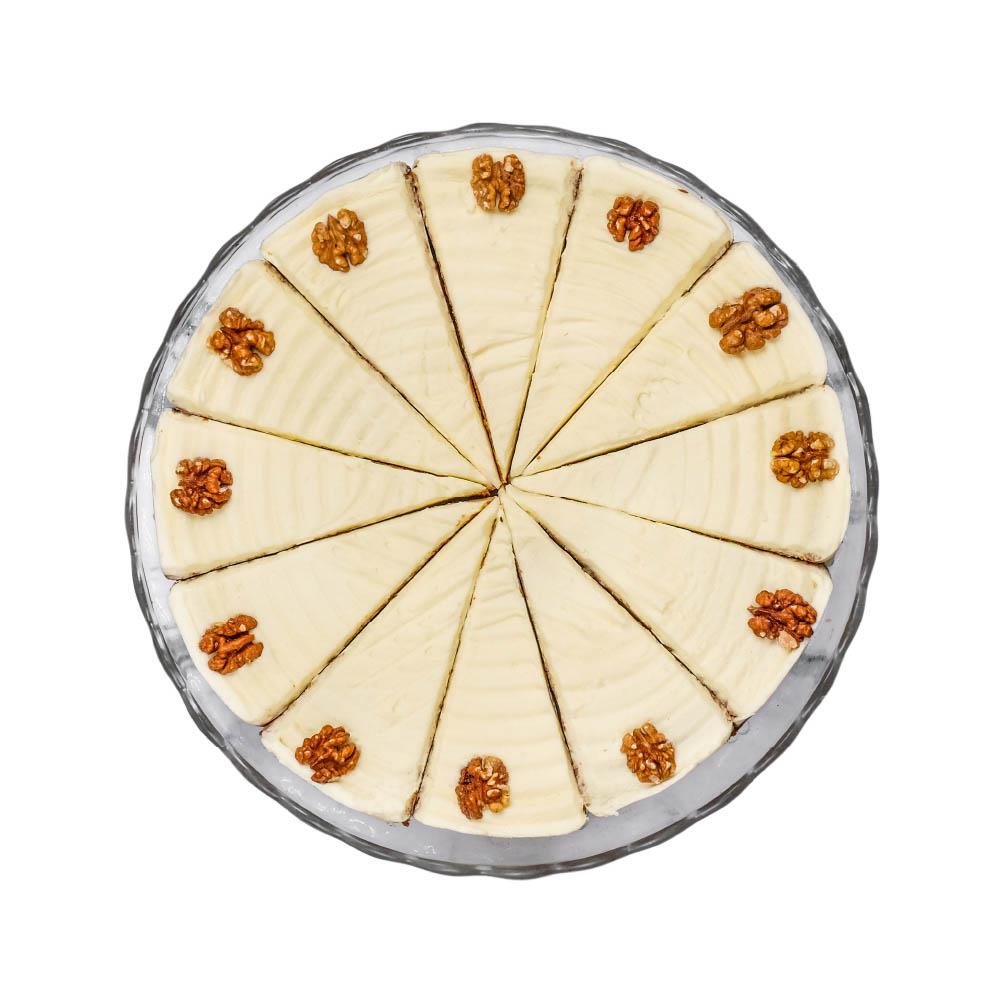 Пряные коржи с добавлением моркови и грецкого ореха, с прослойками крема из творожного сыра.