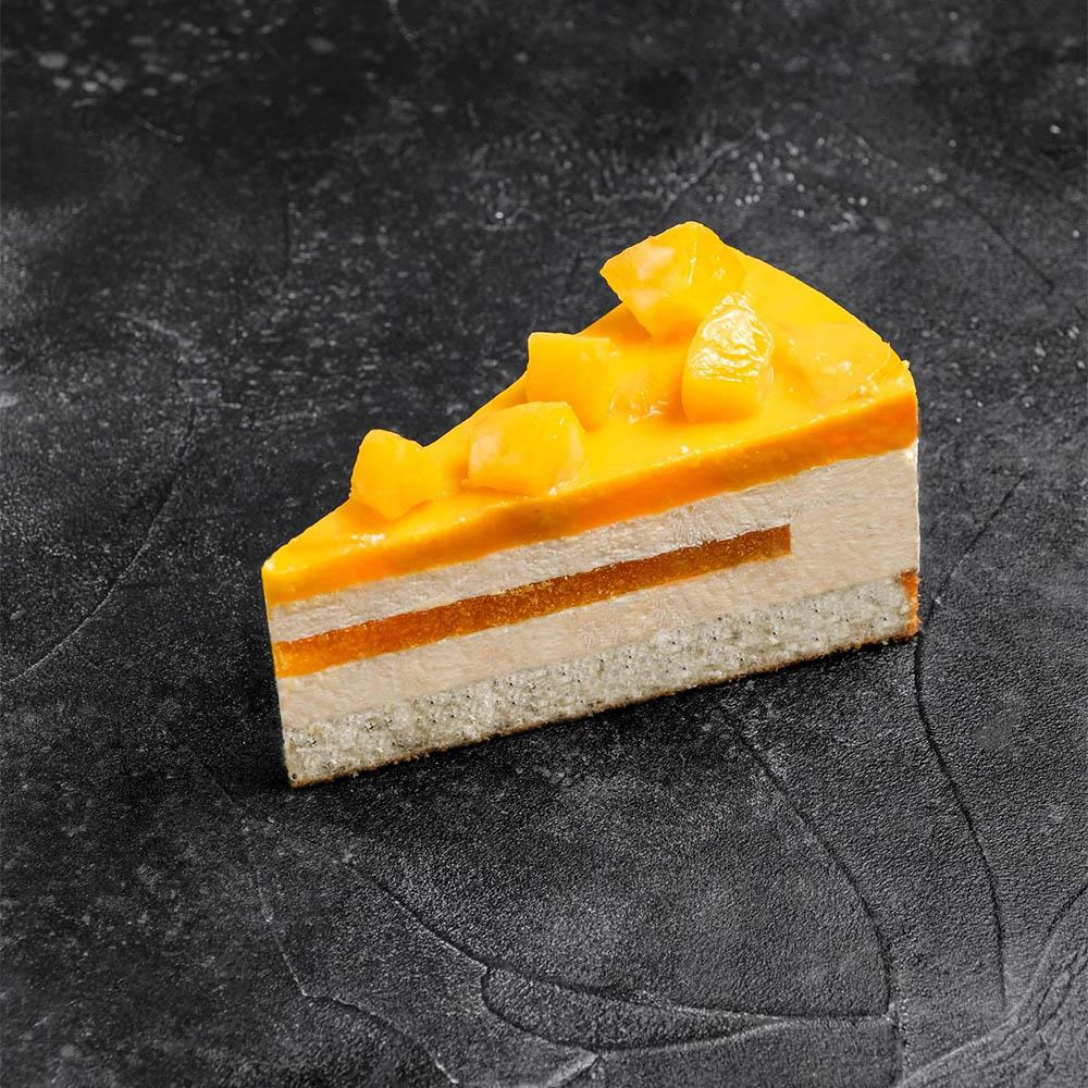 Нежный чизкейк с прослойкой мангового конфи, украшенный пюре маракуйи и нежными кусочками персика.