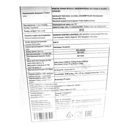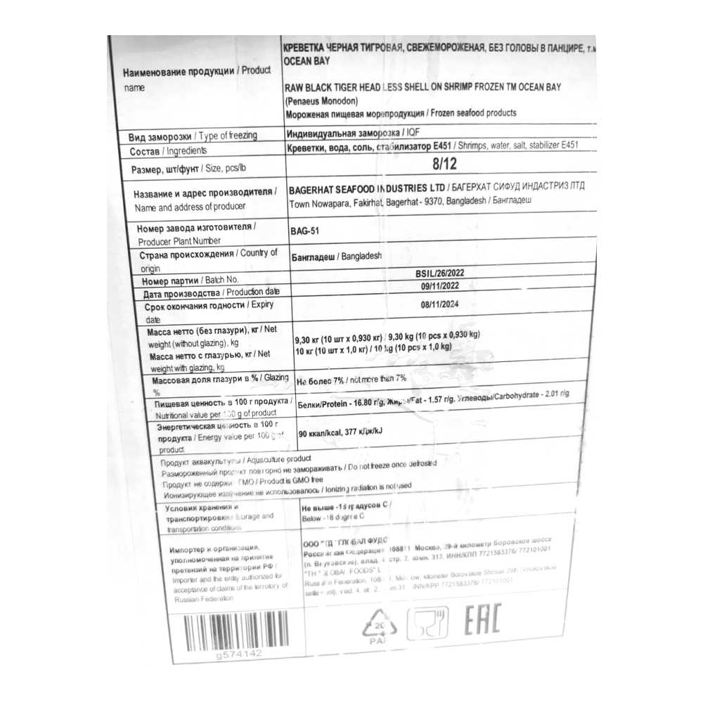 Креветки тигровые черные б/г в панцире 8/12 (lb) 1кг/пакет IQF 7%гл BAG-51 Бангладеш (КОД 57414) (-18°С)