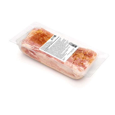 Грудореберная часть (грудинка) без шкуры, без кости, нарезанная на слайсы с ровным срезом. Слайсы уложены в упаковку с нахлестом друг на друга.Упаковано в модифицированной атмосфере в прозрачный лоток, размером 240х120х45 мм. На лицевой стороне лотка нанесен термочек с технической информацией.Не допускается: