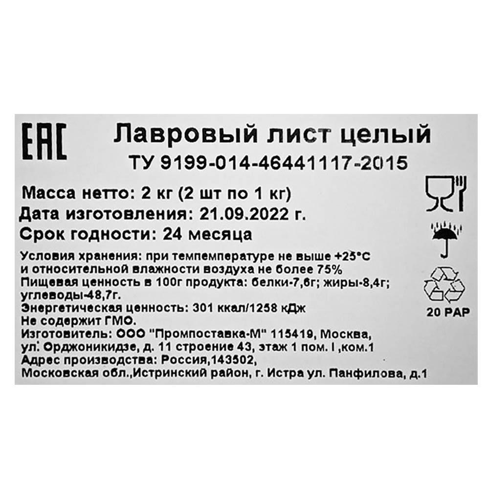 Лавровый лист сушеный целый 1кг/пакет Промпоставка-М Россия (КОД 58472) (+18°С)