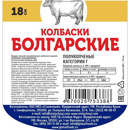 Колбаски говяжьи Болгарские 18см 68грх10шт/упак в/у кат.Г Столичный МПЗ (КОД 58756) (-18°С)