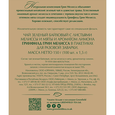 Чай зеленый пакетир Green Melissa 1,5гр х100шт/упак Greenfield™ Орими (0879-09) (КОД 58862) (+18°С)
