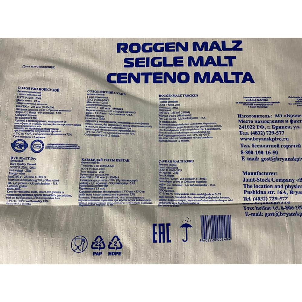 Солод ржаной сухой 25кг/мешок ГОСТ Брянскпиво Россия (КОД 58991) (+18°С)