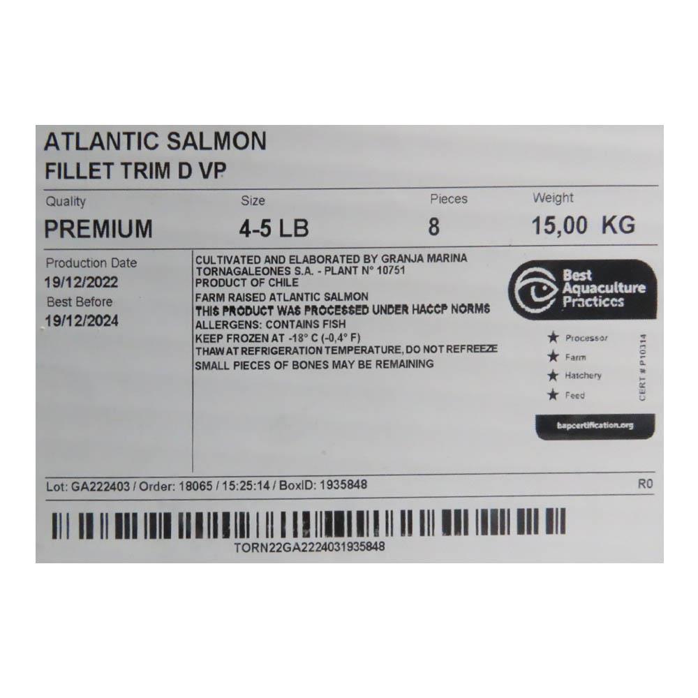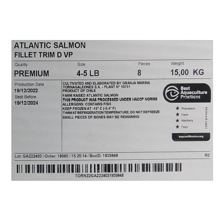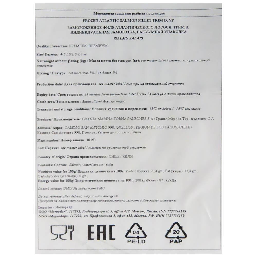 Семга филе с/м на коже 1,8-2,3кг (4-5) в/у trim D 15кг/кор 5%гл Чили (ПУ) (КОР) (КОД 58706) (-18°С)