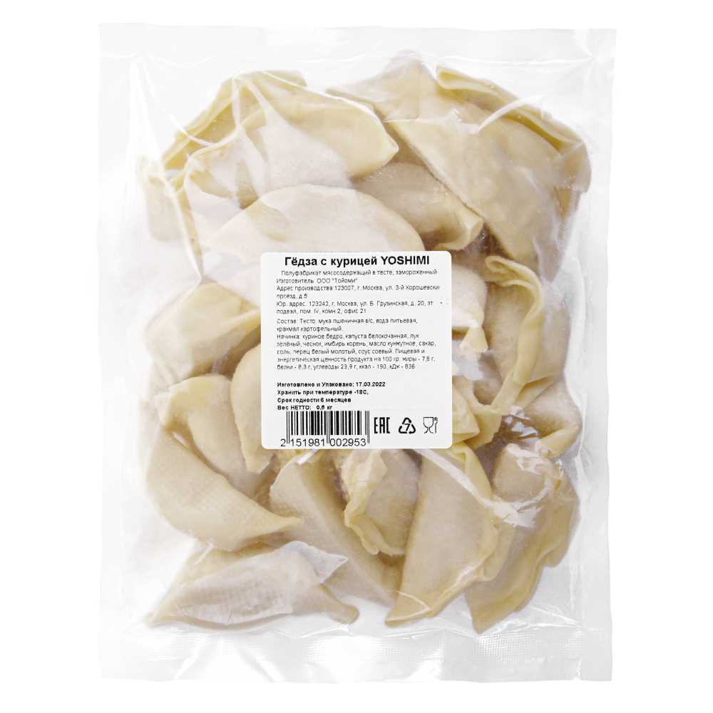 Фарш: филе куриного бедра, капуста белокочанная свежая, крахмал картофельный, вода питьевая, корень имбиря свежий, масло кунжутное нерафинированное, соус соевый (вода, соевые бобы, пшеница, соль, сахар, консерванты(сорбат калия, бензоат натрия), сахар, чеснок свежий, лук зеленый свежий, соль пищевая, перец белый молотый; Тесто:мука пшеничная хлебопекарная высшего сорта, вода питьевая, крахмал картофельный, соль пищевая, масло подсолнечное рафинированное дезодорированное Аллергены: кунжут, соя, злаки содержащие глютен. Продукт может содержать следы арахиса, горчицы, орехов, ракообразных, рыбы, молока, яиц и продуктов их переработки