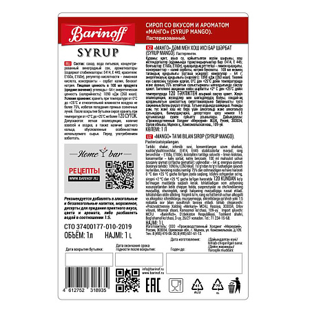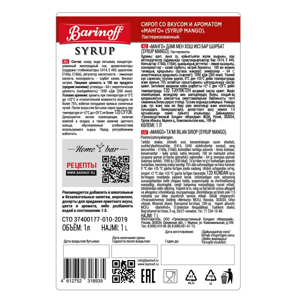 Сироп Манго 1л ст/б Barinoff Syrup™ Россия (КОД 59717) (+18°С)