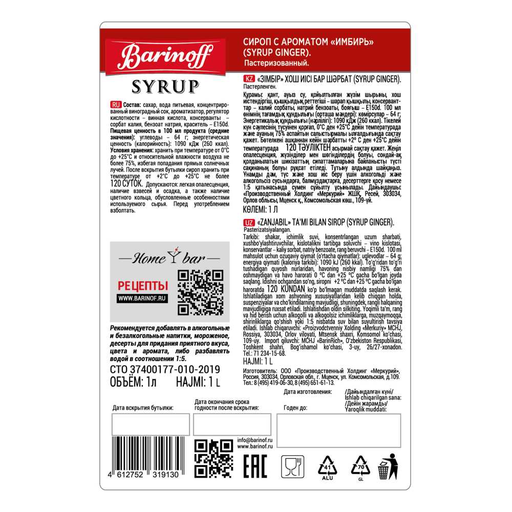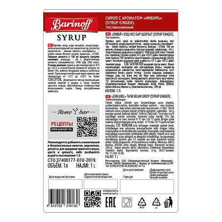 Сироп Имбирь 1л ст/б Barinoff Syrup™ Россия (КОД 59780) (+18°С)