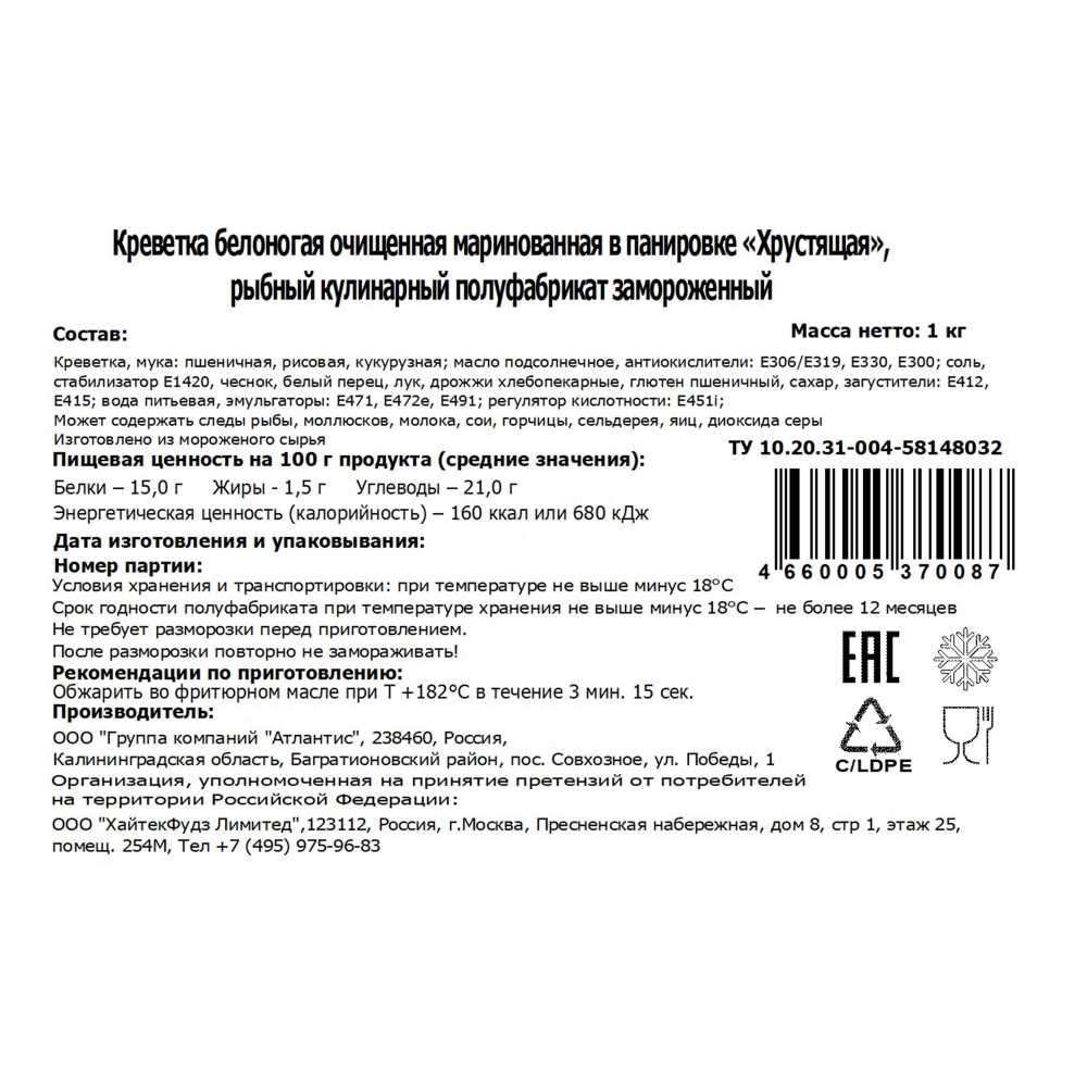 Креветки в панировке Хрустящая 1кг/пакет Группа компаний Атлантис Россия (КОД 60157) (-18°С)