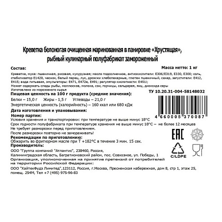 Креветка, мука: пшеничная, рисовая, кукурузная; масло подсолнечное, антиокислители: Е306/Е319, Е330, Е300; соль, стабилизатор Е1420, чеснок, белый перец, лук, дрожжи хлебопекарные, глютен пшеничный, сахар, загустители: Е412, Е415; вода питьевая, эмульгаторы: Е471, Е472е, Е491; регулятор кислотности: Е451i