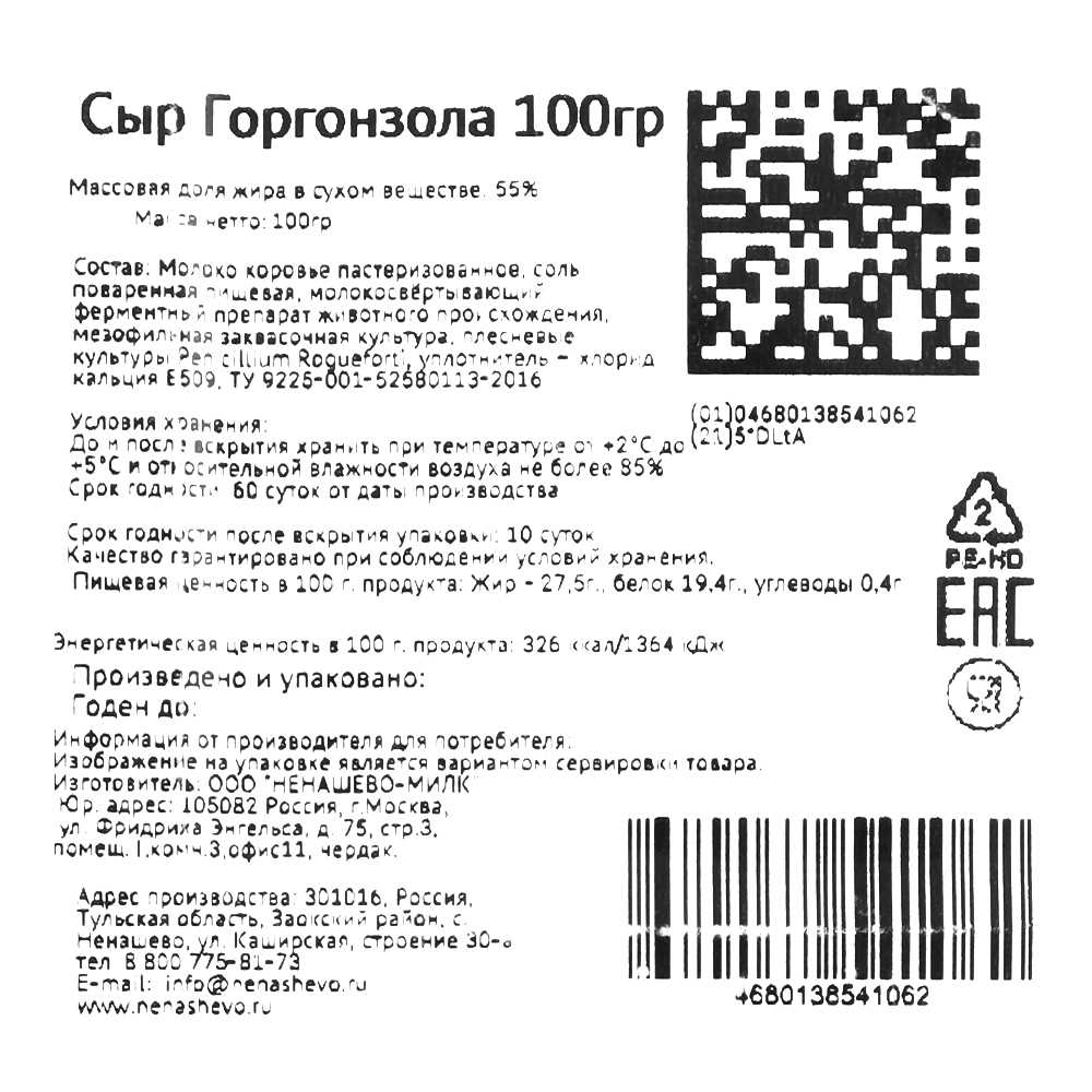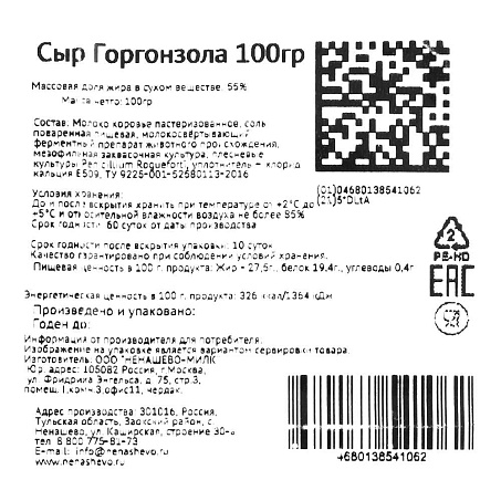 Сыр Горгонзола с голубой плесенью 55% 100гр лоток БЗМЖ Ненашево™ Россия (КОД 61434) (0°С)