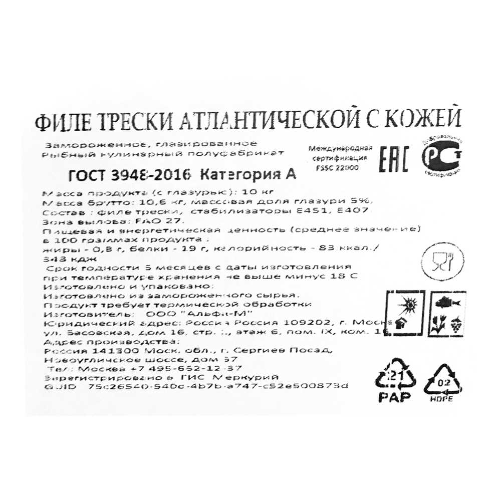 Треска атлантическая филе на коже 10кг/кор IQF 5%гл кат А ГОСТ Альфа-М (КОР) (КОД 62353) (-18°С)