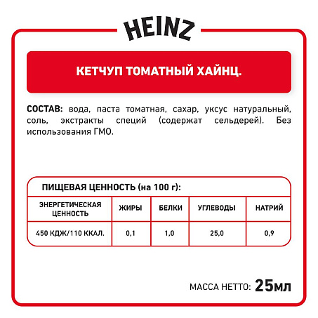 Секрет эталонного вкуса Томатного Кетчупа Хайнц — натуральные специи и сбалансированный рецепт. Стабильность качества Томатного Кетчупа Хайнц обеспечивают специально выращенные сорта томатов с повышенным содержанием пектина и ликопина. Классический Томатный Кетчуп Хайнц делает богаче вкус любого блюда, будь то картофель фри, наггетсы, бургеры, хот-доги или пицца. Незаменим в меню ресторана как дополнение к овощным гарнирам, жареному мясу и горячим колбаскам, особенно карривурстам.