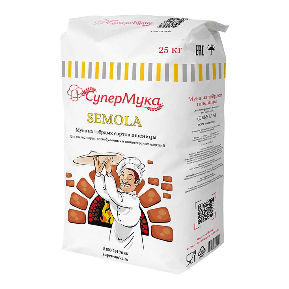 Мука из твердых сортов пшеницы Семола д/мак изд 25кг в/с ГОСТ Супер Мука (КОД 62664) (+18°С)