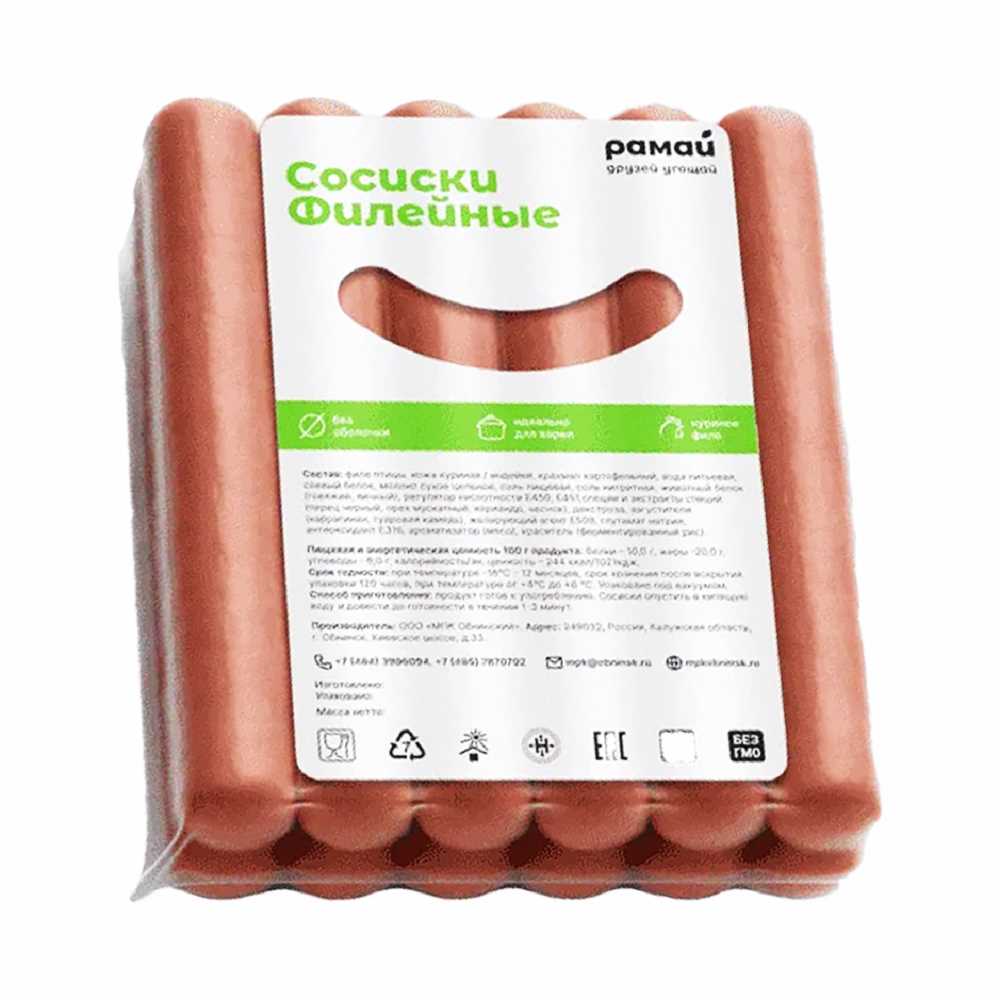 Сосиски Филейные из птицы зам б/оболоч 60гр 17см Ø22мм 720гр в/у Халяль Рамай Обнинский МПК (КОД 63458)(-18°С)